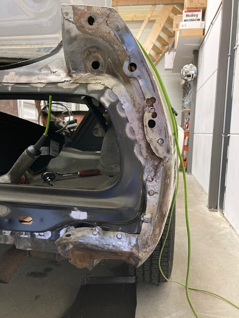 Next up: fixing the new quarter panel's drop-off. Like so many pieces of "new" sheet metal it's usually put together pretty poorly. I had to put some extra spot welds in and add a little to the edge that sits under the wheel well because it was too short:
